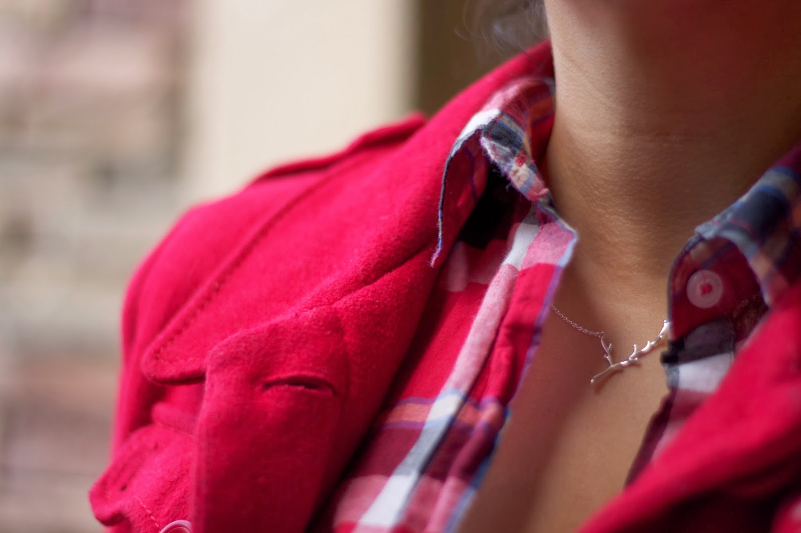 About the Outfit: Red Jacket (Similar), Forever 21 plaid top, Blue Nile branch necklace, Hudson Jeans, Hunter Boots, Blue Nile Branch Necklace ℅.