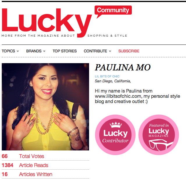 Happy Sunday!! About 2 months ago I was contacted by Lucky Magazine asking if they could include a picture they had seen from me on the Lucky Community in their November Issue. After re-reading the email 10 times in disbelief I said OF COURSE!! Here I am 2 months later waiting anxiously! This morning as I was purchasing some bacon and a croissant for this morning’s breakfast, I see it the new Lucky Magazine (with fellow Latina Sofia Vergara on the cover) by the cash register! I anxiously opened it and when I saw myself in this magazine I truly admire, I almost cried and let out an “OMG” out loud.