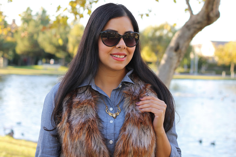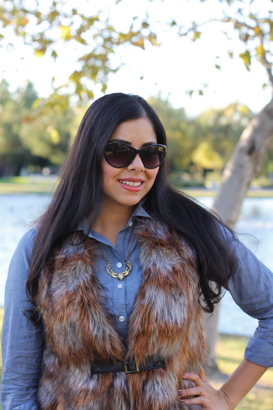 As the leaves turn brown and the weather cools off, it’s finally time to bust out the faux fur vest (last worn here)! I love the concept of playing with textures because when an outfit is lacking in color, it can shine in textures. In this outfit, I chose to layer a Faux Fur vest over a chambray top paired with faux leather pants and faux leather booties, all of which have become very popular textures every fall & winter. To top it off, this outfit was really cozy and comfortable! Hope you like it and have a great Wednesday!