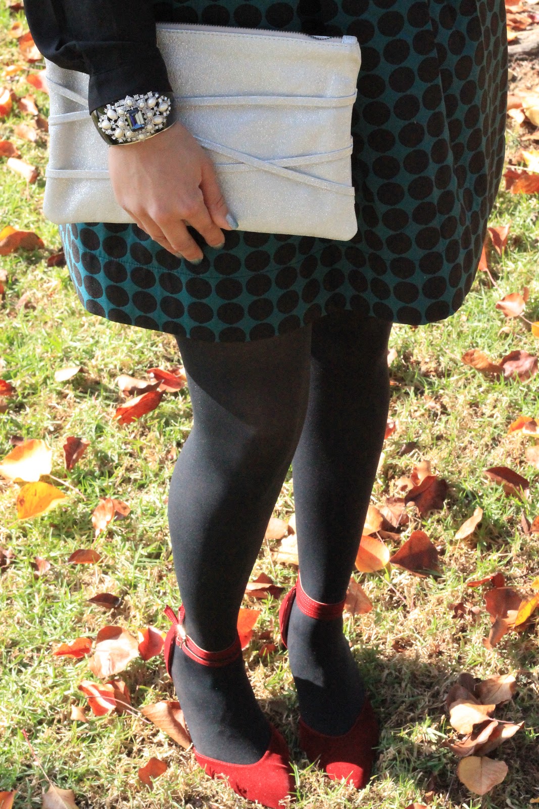 As you may recall from this previous post, I wore this dress to my friends’ wedding and decided to bring it out for another spin. To change up the look, I layered this blouse and blazer over it, added some tights to keep warm and of course the holiday sparkle via this gorgeous Fena clutch in “fairy dust”! Layering over fit and flare dresses is easy because of the proportions and can make a patterned dress like this one versatile.  Hope you enjoy this look, and hope this inspires you to bring out an ol’ dress out of the closet that you can layer over! Stay tuned for more Holiday looks!