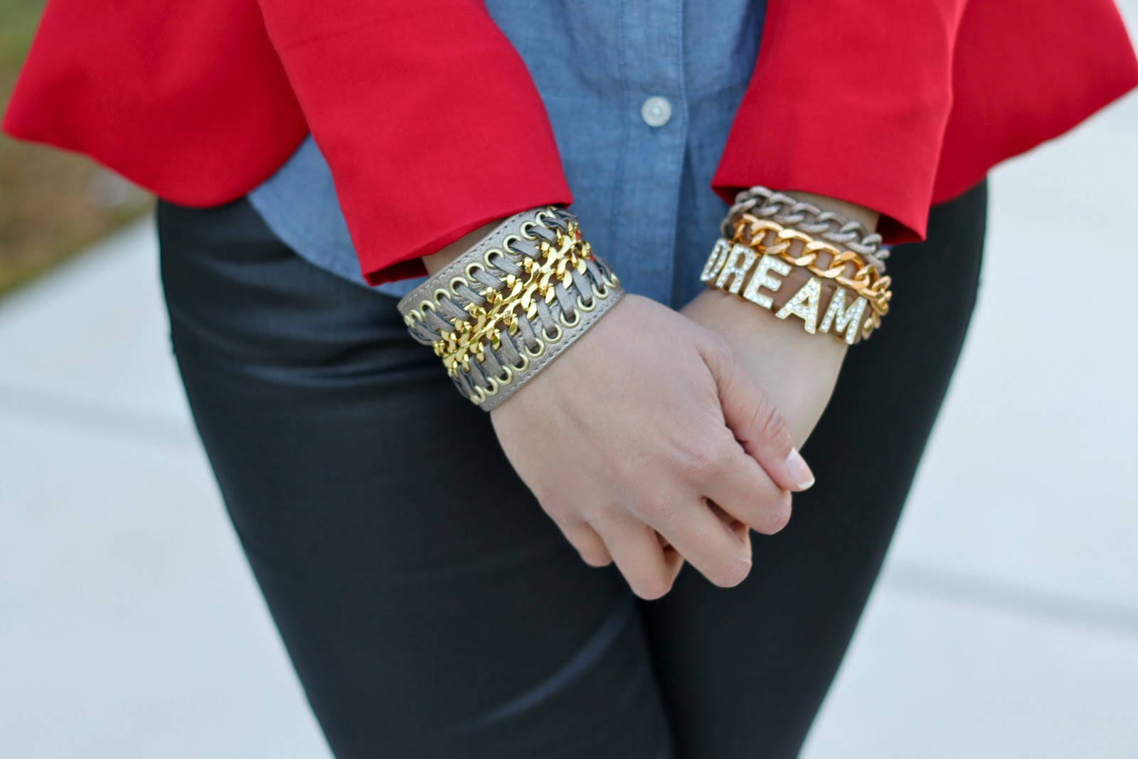About the Outfit: Forever 21 Red Blazer (similar), Old Navy Chambray (similar), Forever 21 Faux Leather pants, Nine West leopard heels (similar), Cuff and “Dream” bracelet ℅ Tanya Kara Cuff (get 10% off all items here), chain bracelet ℅About Pretty Things, Lion Necklace local boutique, Red Lipstick (here)