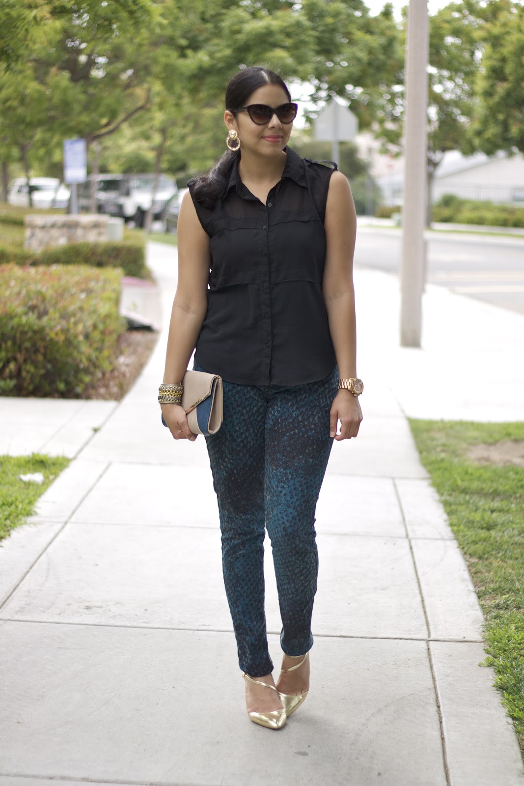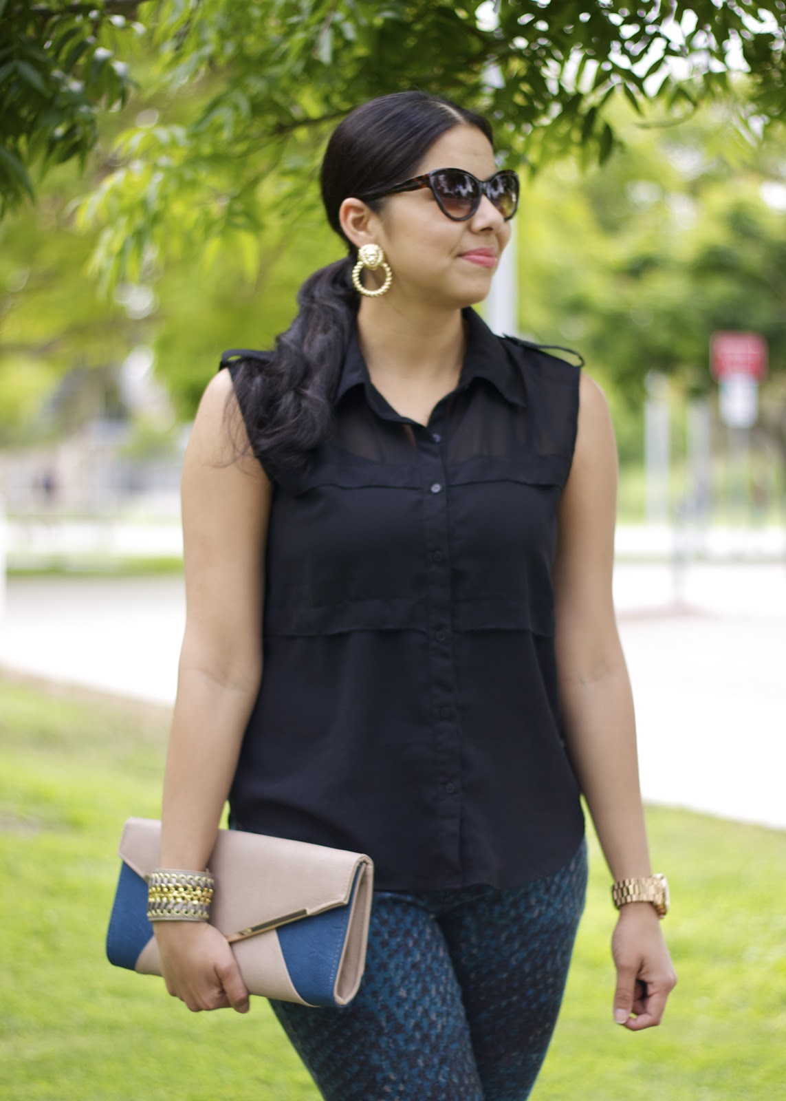 About the Outfit: F21 Top (similar $14) & Earrings (similar here), Target Style Pants (similar), Michael Kors Large Runway Watch, Cuff ℅ Tanya Kara Jewelry (10% off here), Clutch ℅ Urban Expressions.