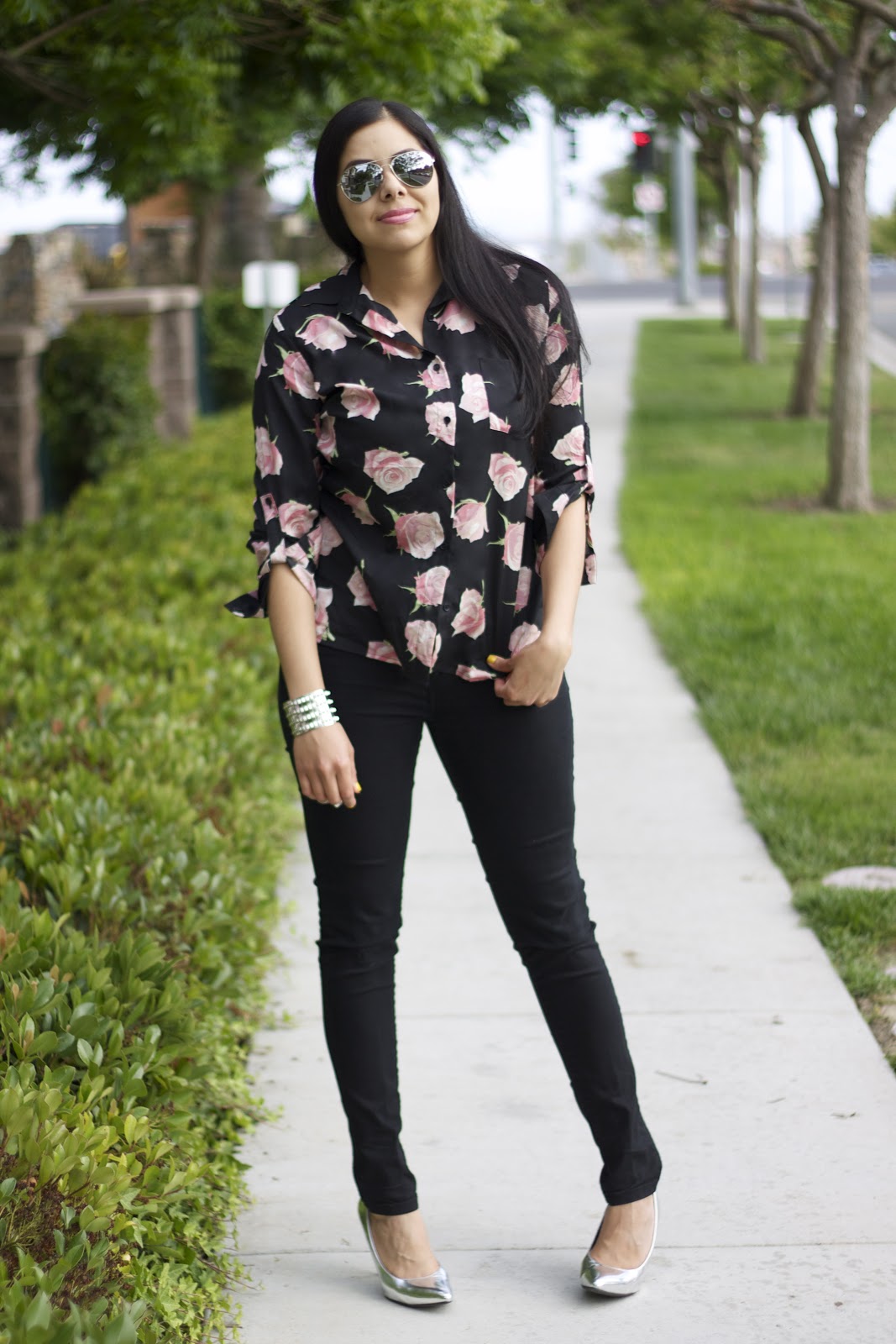 Target Silver Shoes, Rose Top (Similar), Forever 21 black skinnies, Charlotte Russe Sunnies, Cuff $5