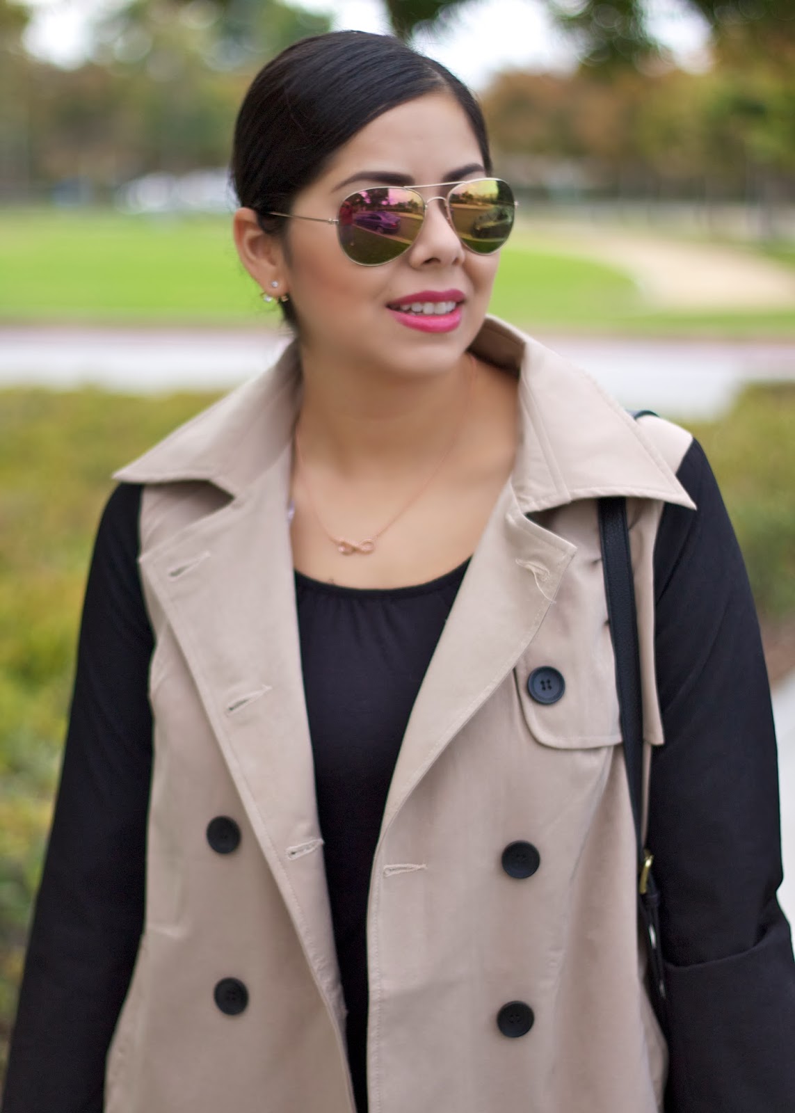 About the Outfit: Lulus.com Trench here ℅, Forever 21 tunic, Polarized Sunglasses here! and Coated Pants (similar), Franco Sarto booties via Marshalls c/o, 3.1 Phillip Lim for Target Purse, Tanya Kara Necklace c/o.