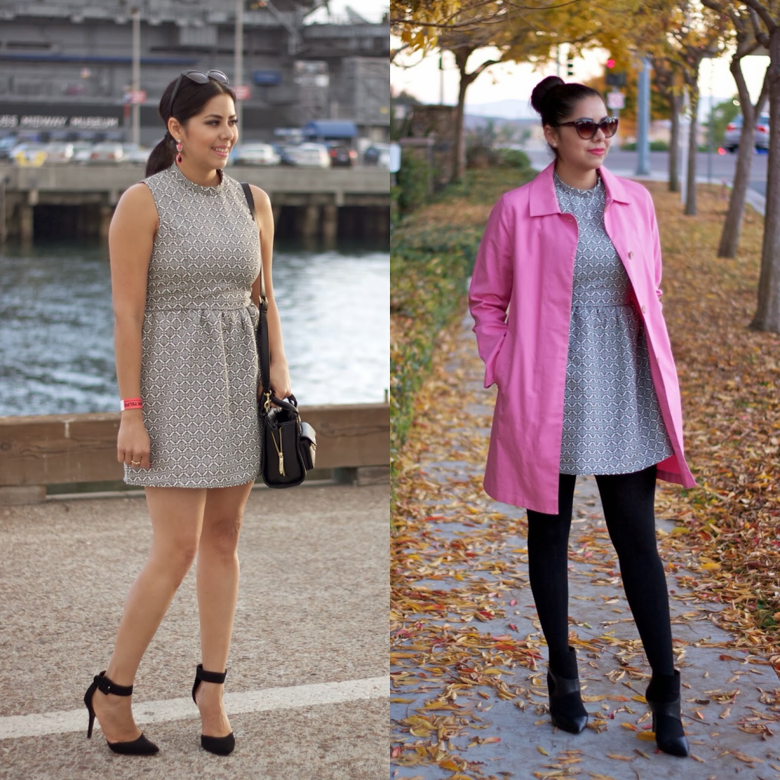 One of my blog’s most important tasks is to give you ideas on how to wear pieces in different ways and to show you how versatile some pieces (especially if it means saving money in the end). We all know basics are versatile but what about those patterned dresses or colored coats that at first thought seem like a one time thing? Well, today I wanted to recap 3 looks that I have done on the blog that demonstrate 1) two ways to wear a pink coat from casual to dressy and 2) two ways to wear a mod dress from hot to cold!