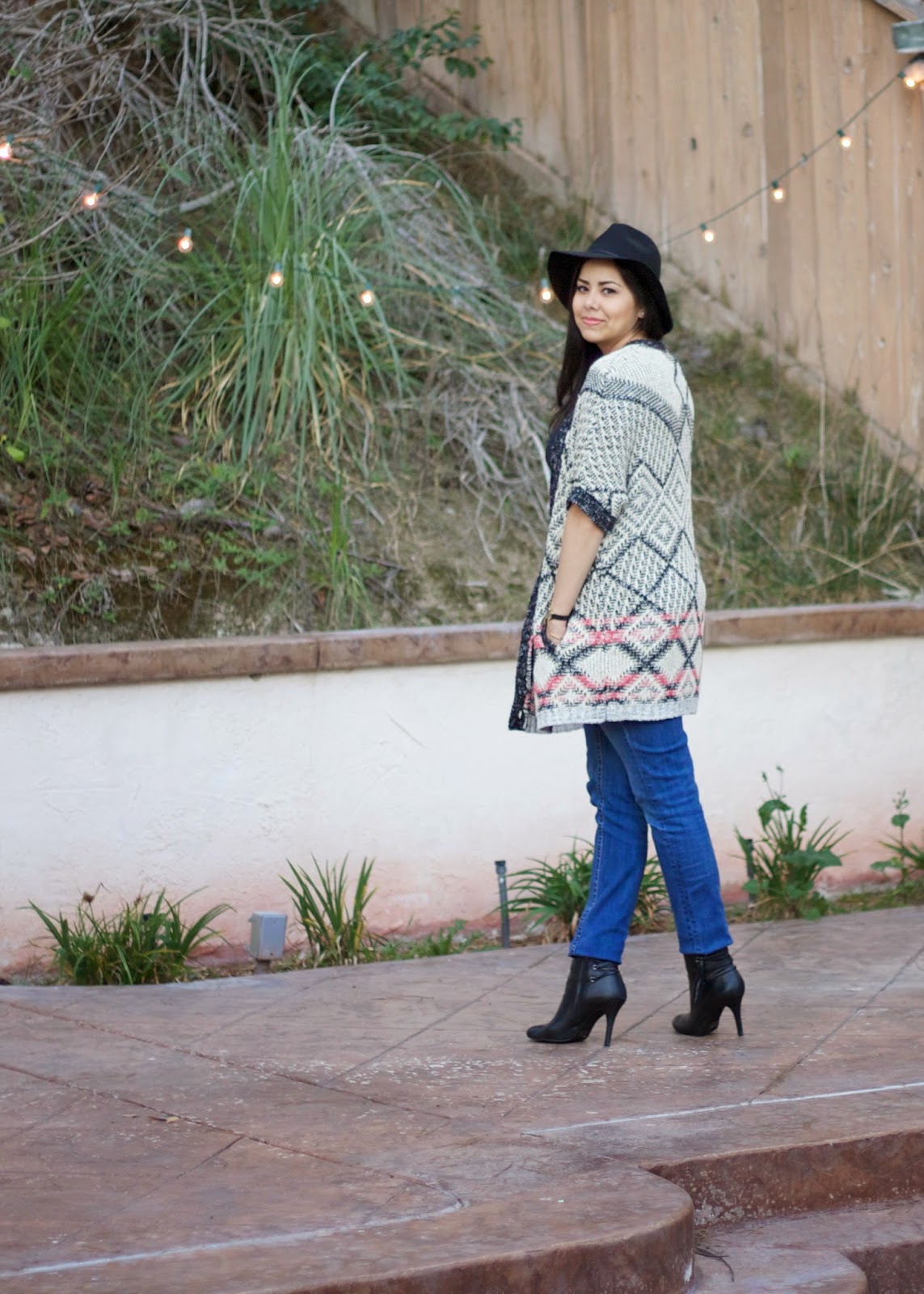 About the Outfit: Provence Sweater c/o CAbi Clothing | Bebe Top | Miss Me Jeans c/oTarget Black Fedora HatLuxe by JustFab booties and similar | Vintage Gucci watch | Gorjana cuff c/o