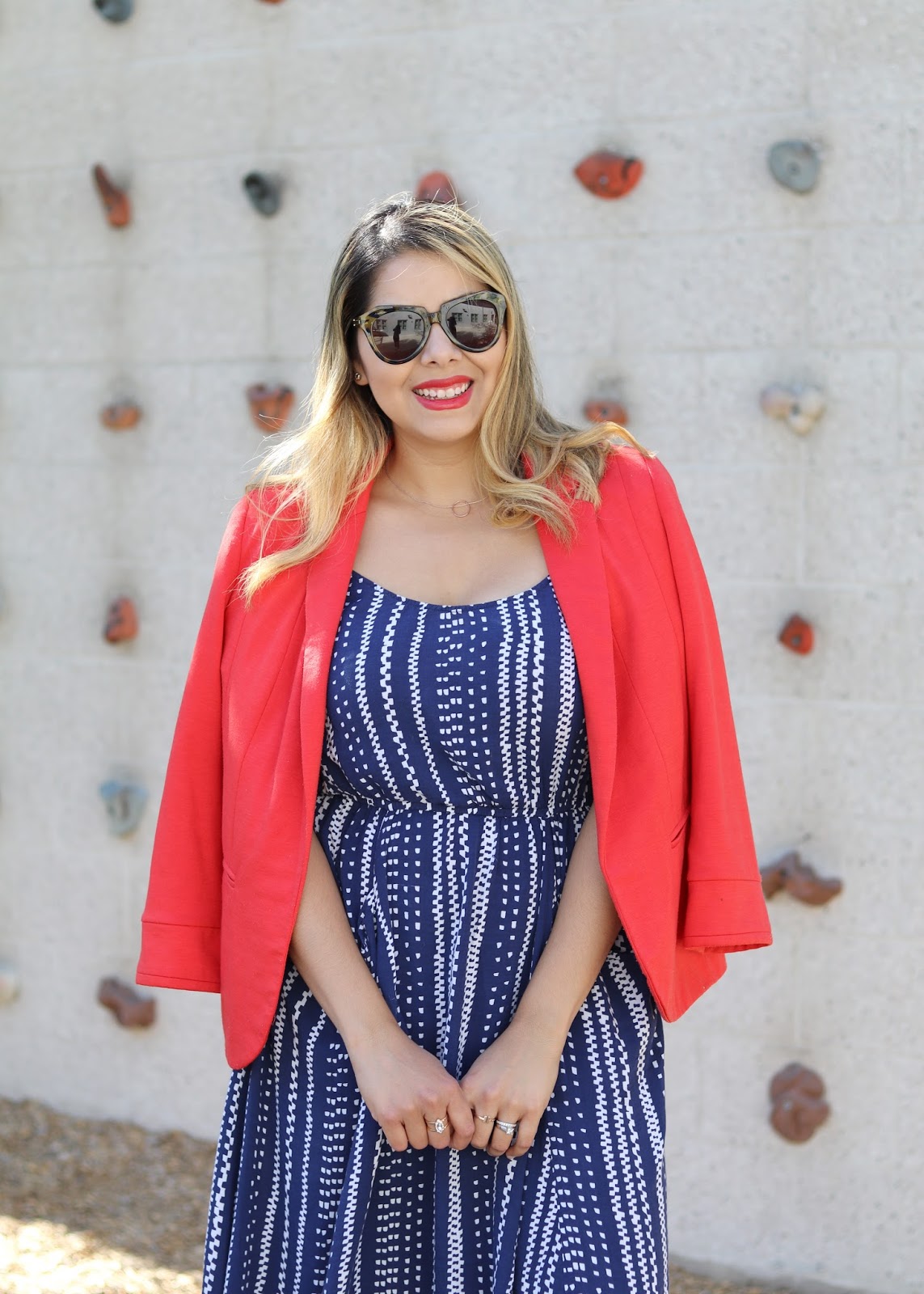 About the Outfit: Cabi “Margherita” Dress (here) Red Blazer | Shoedazzle white wedges (similar) | Karen Walker Sunglasses | bareMinerals lipstick in “Light it Up” | H&M Necklace | Pictures by Laura Neuzeth