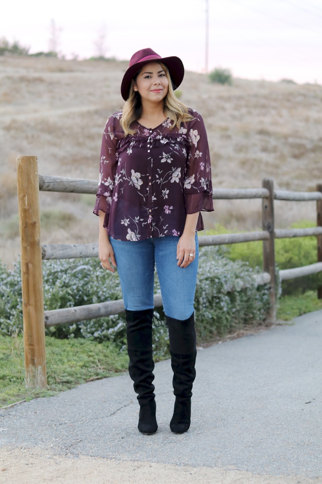 Happy Halloween! Unfortunately (or fortunately for some of you) there is nothing scary about today’s outfit, it’s actually quite the opposite! What do you get when you want to be girly in fall? This outfit that features a flowy floral top and these over the knee boots that I know I’ve been repeating too much lately (eek!) I also have been wanting to play with the blush and burgundy color combo this season because it oozes fall girlyness and elegance so this is my first take on it (more to come).