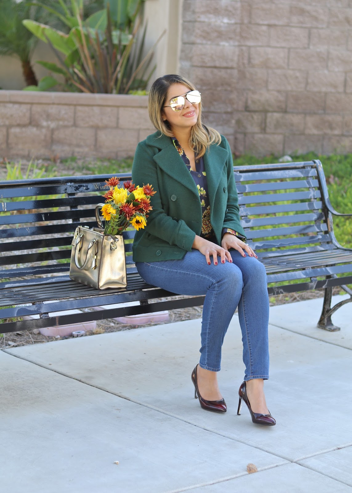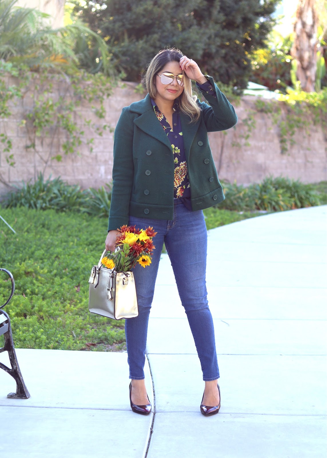 About the Outfit: LS Revolution Catwalk Pump (here) | cabi’s Daisy Blouse (here) | cabi’s Sweater Pea Coat | Old Navy Jeans (here) | Galian Handbags | Quay x Desi Sunglasses
