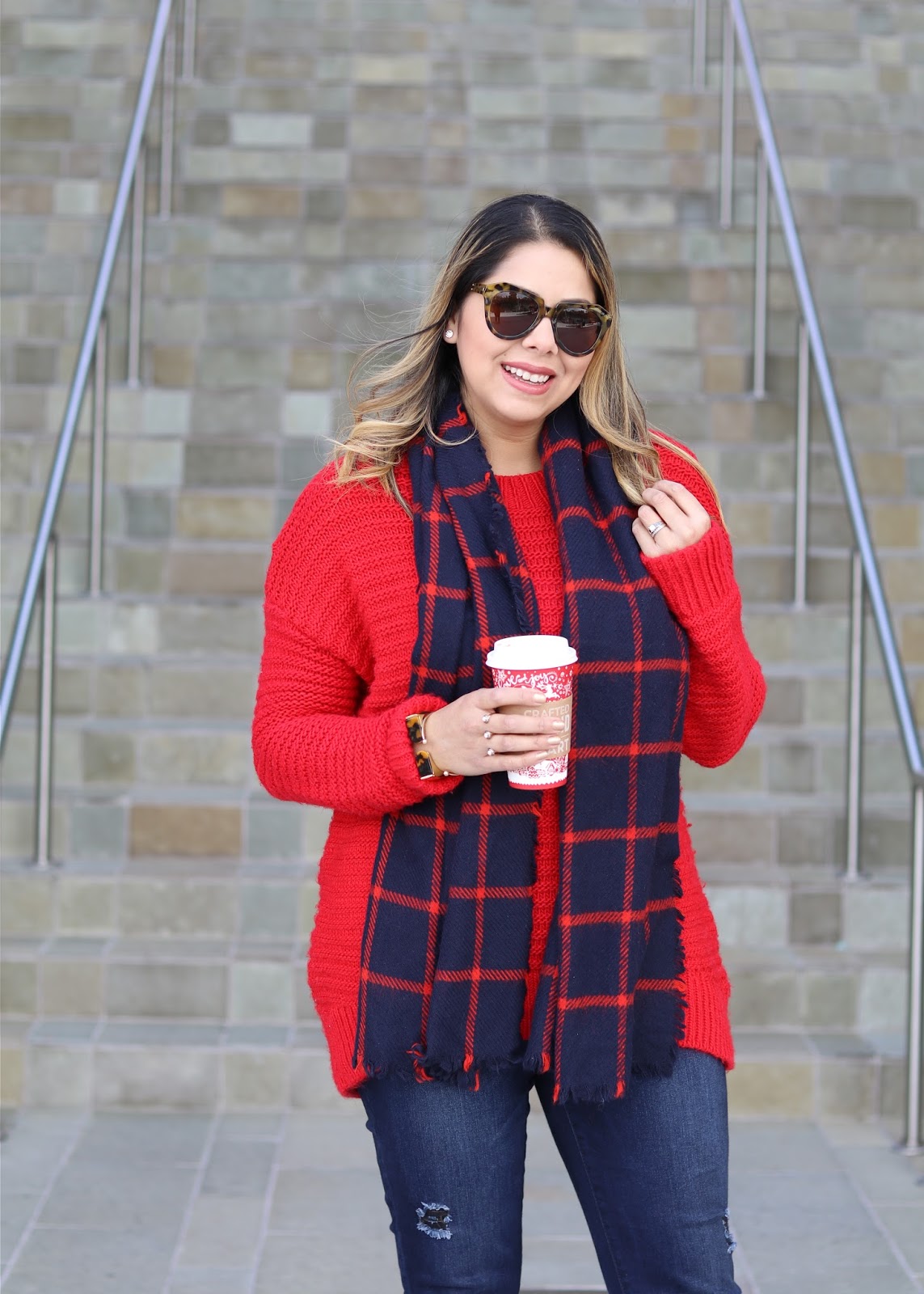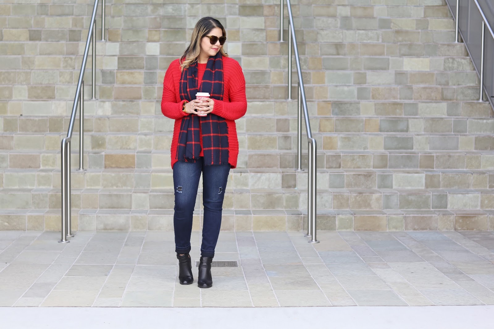 What to wear for Christmas, casual outfit for the holidays, red and navy blue scarf