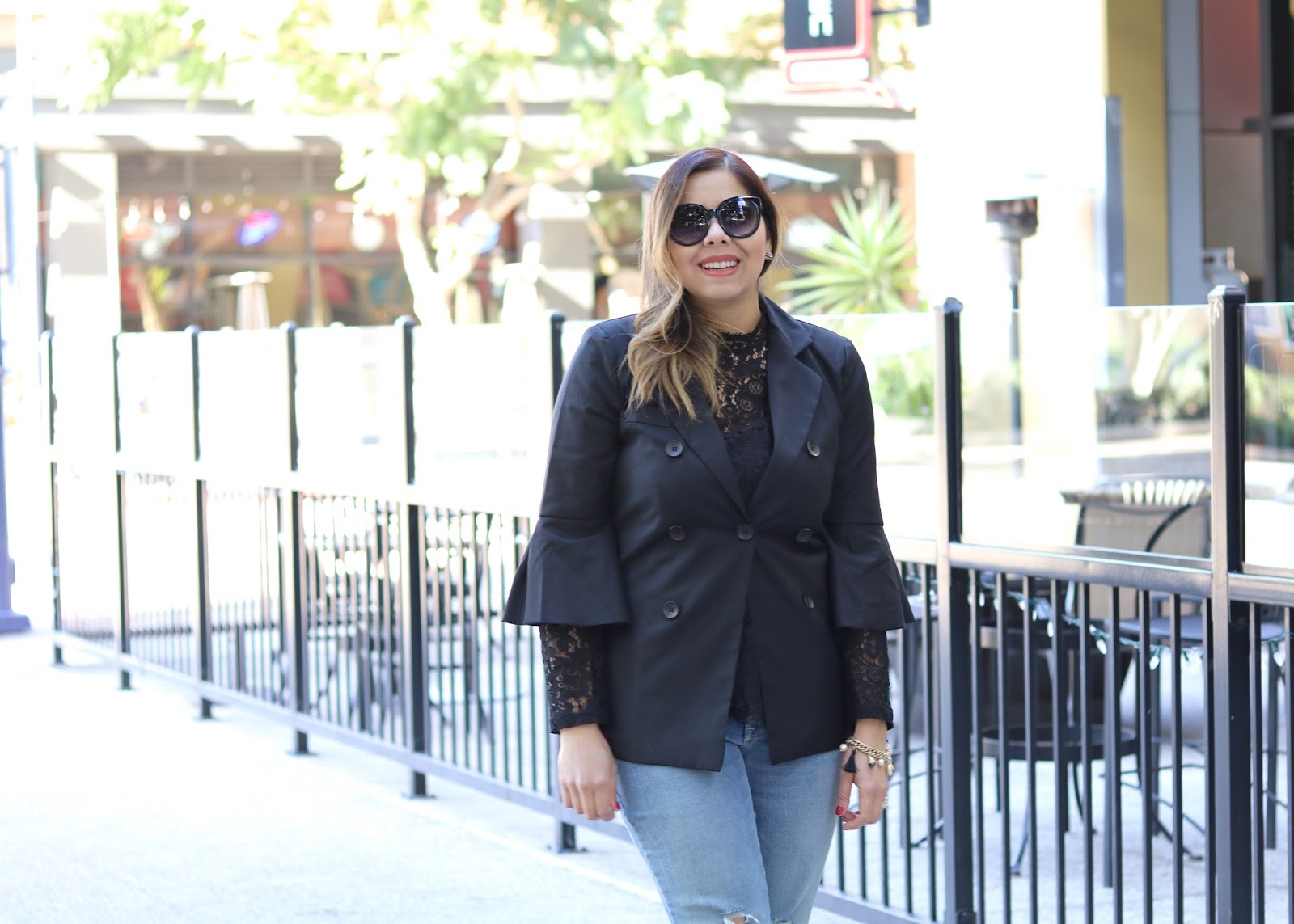 Chicwish blazer with frilly sleeves, lace top from H&M, elegant lace outfit