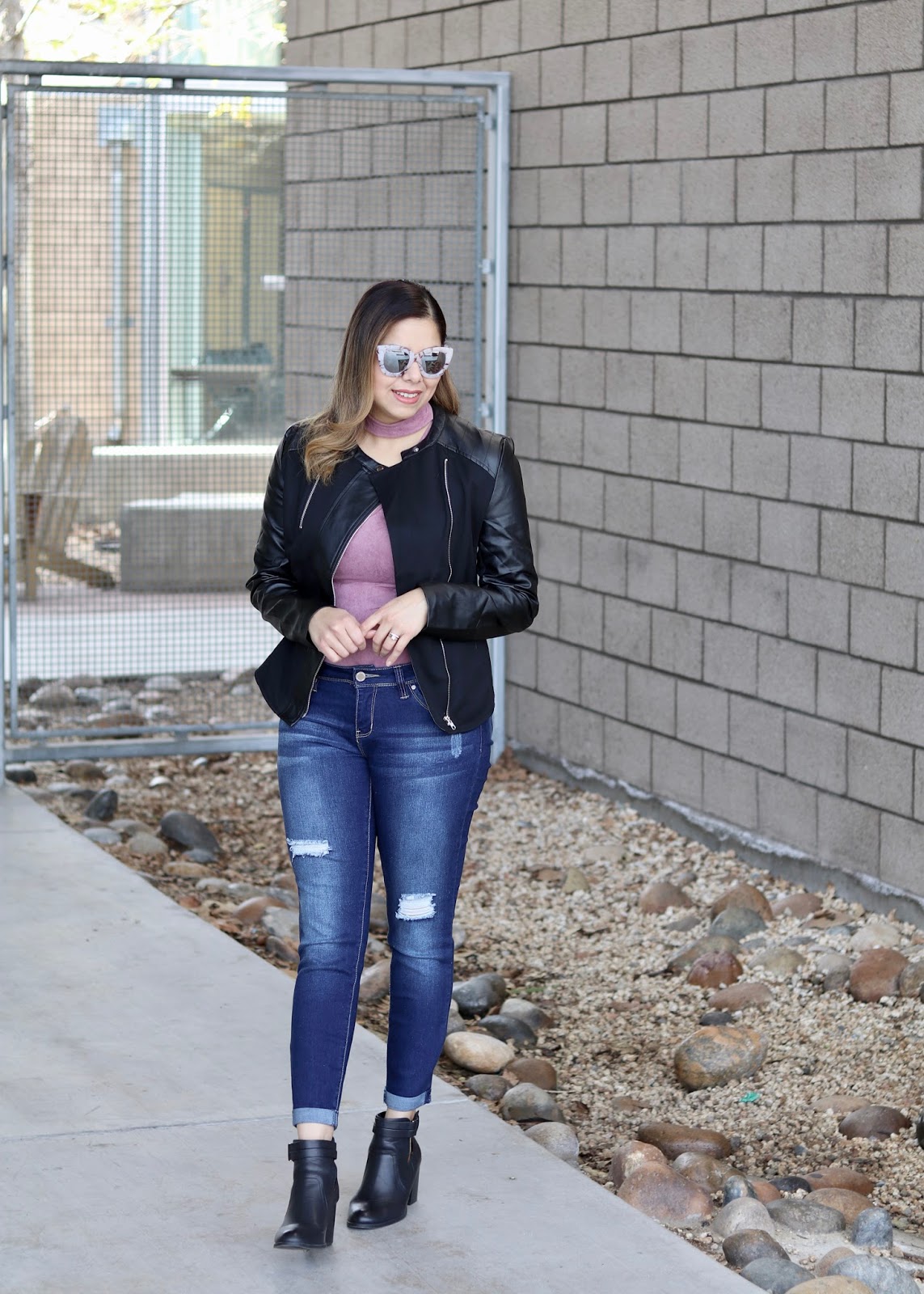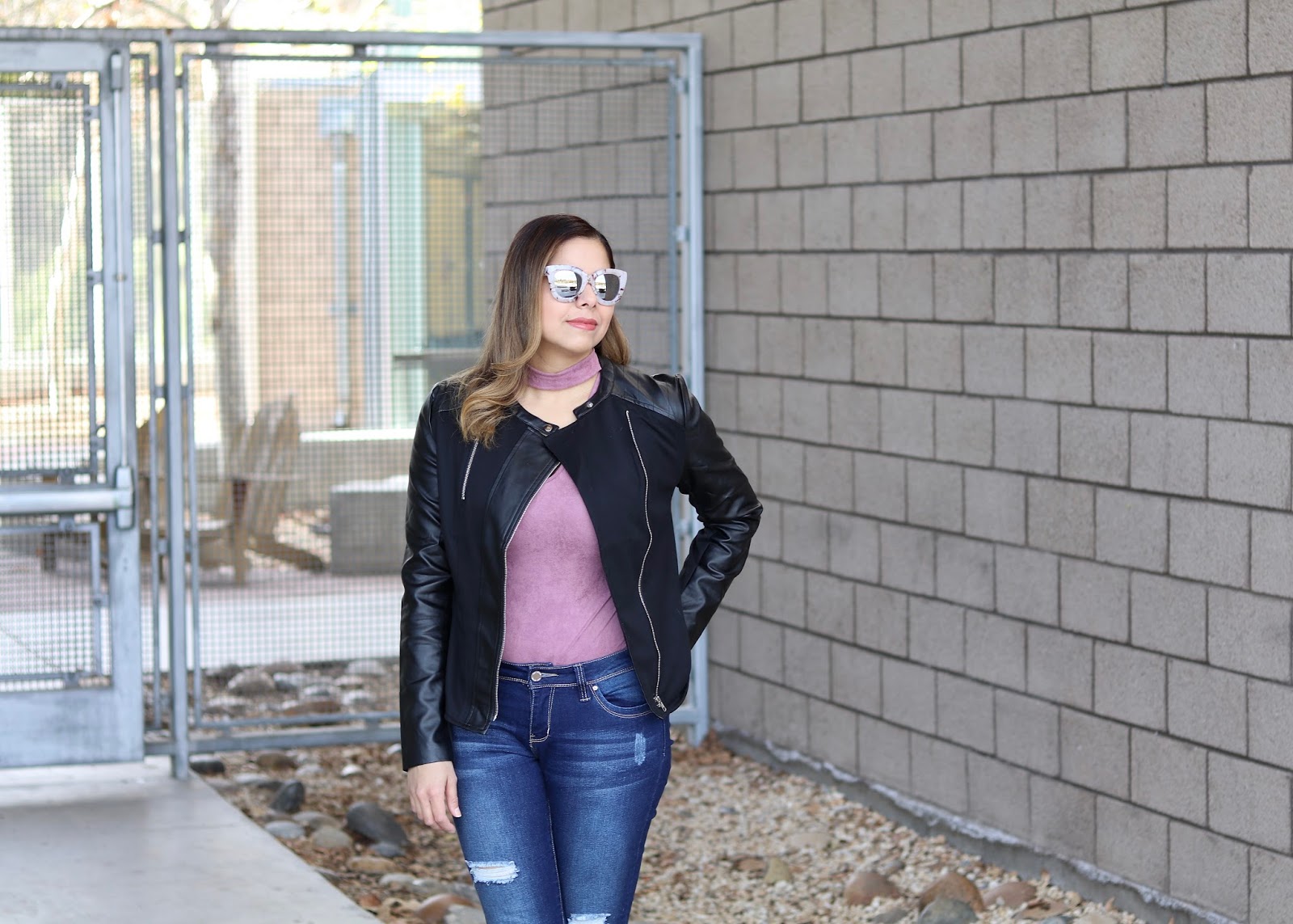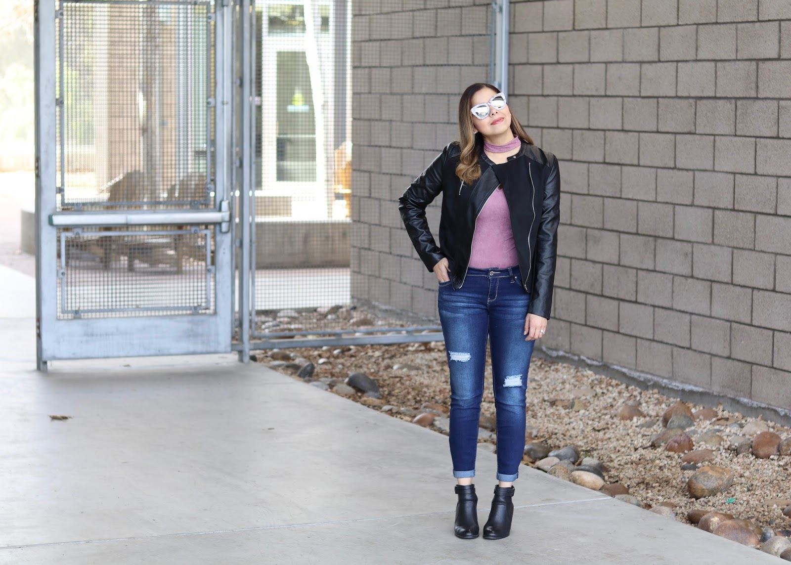 A structured moto jacket adds instant edge and I opted to pair it with this cool body suit that has an added choker (because you know how I love chokers)! When I saw this body suit I was instantly drawn to the color and texture, it’s like a stretchy leather looking material.