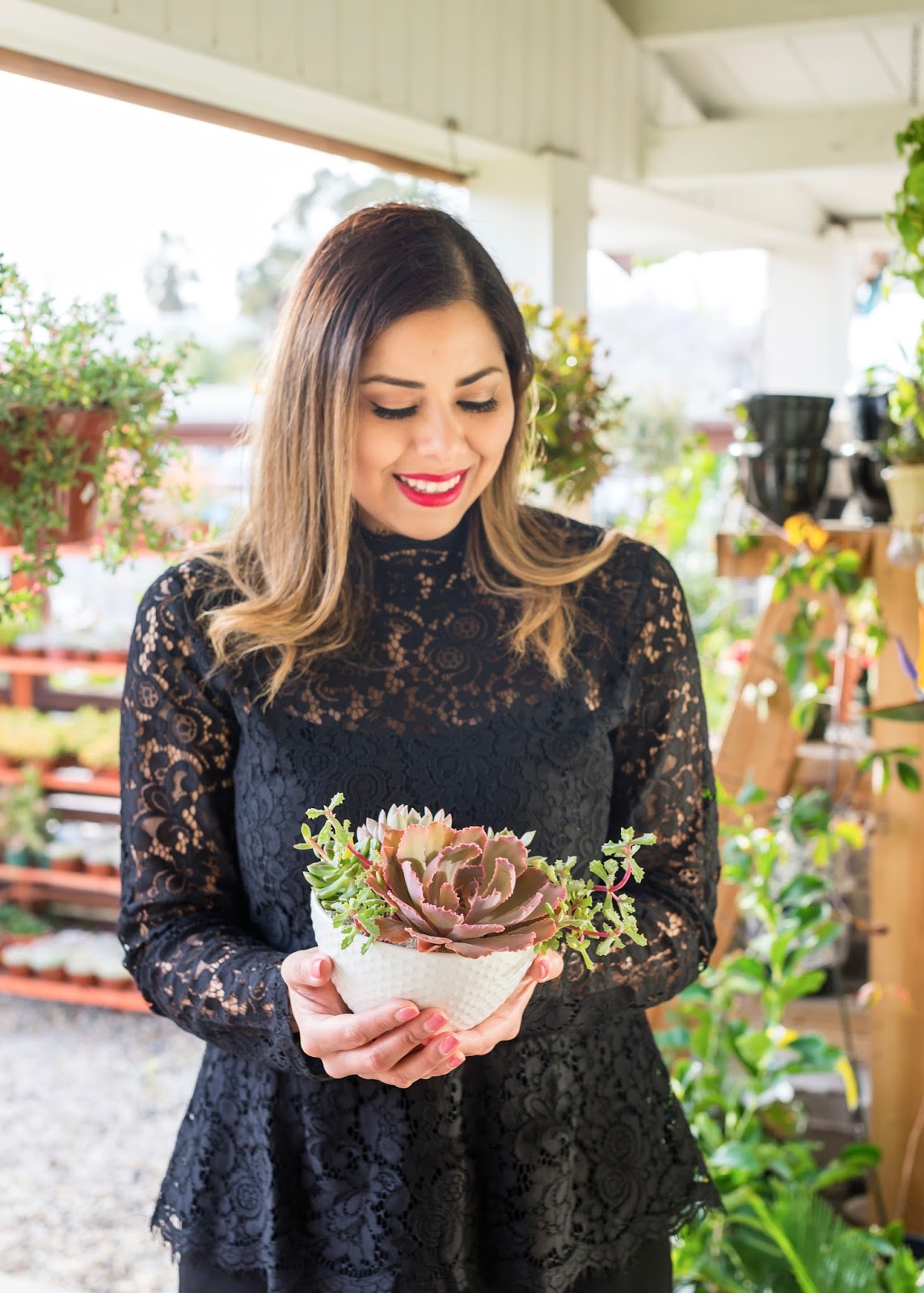 About the Outfit: H&M Lace Top sold out, but similar here | cabi black trousers (similar here) | Heels (similar) | MAC Liptensity lipstick in “Mulling Spices”