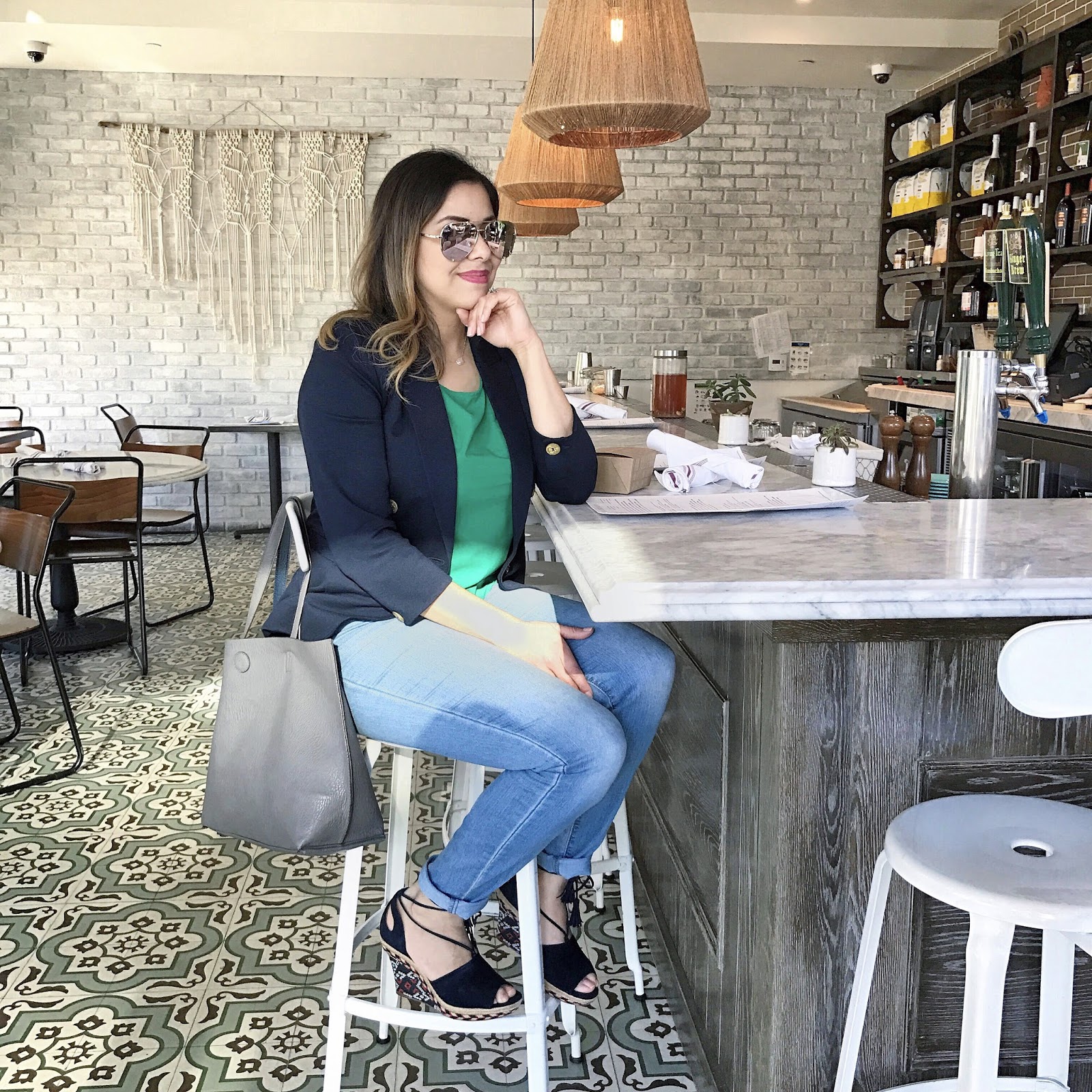 Wearing: cabi Blazer | Forever 21 top | Old Navy Jeans | cabi Wedges | Quay High Key Sunglasses and Galian Handbag Tote
